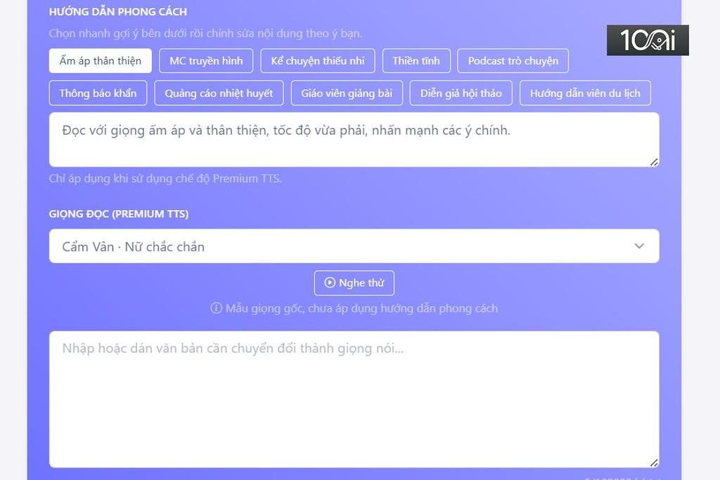 - Dễ dàng chọn phong cách đọc phù hợp với từng mục đích sử dụng như: giảng dạy, thuyết minh, podcast, audiobook, thông báo nội bộ...