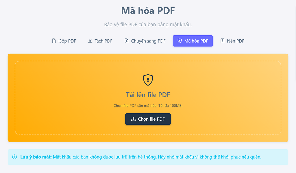 Không cần cài đặt phần mềm phức tạp như một số công cụ hiện nay, bạn hoàn toàn có thể đặt mật khẩu cho file PDF ngay trên trình duyệt với công cụ tại 100ai.