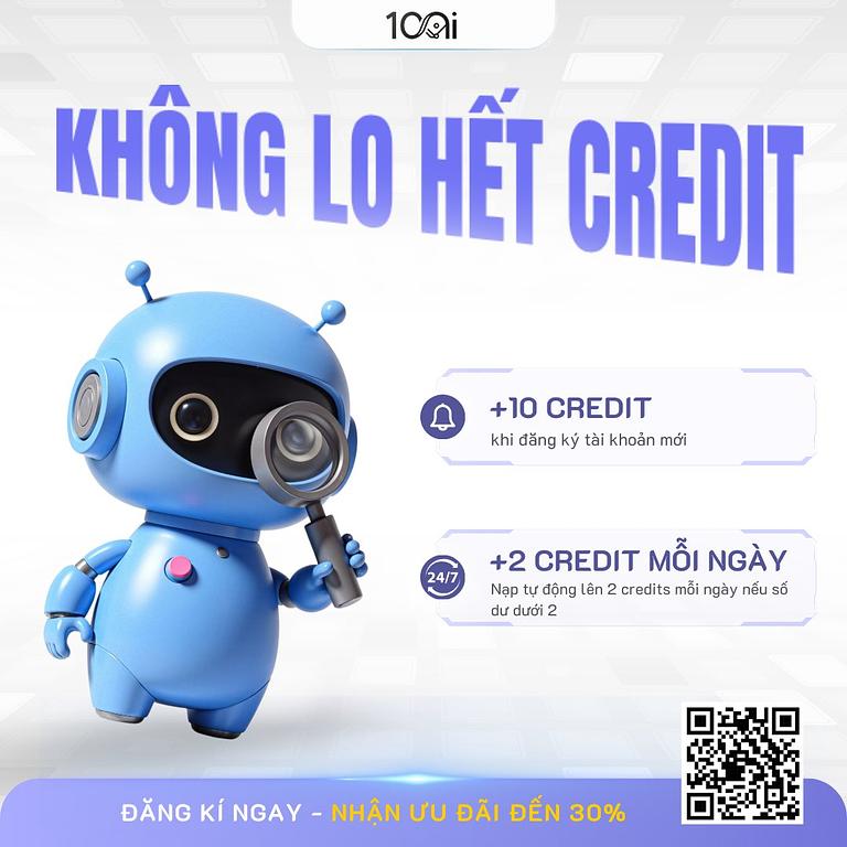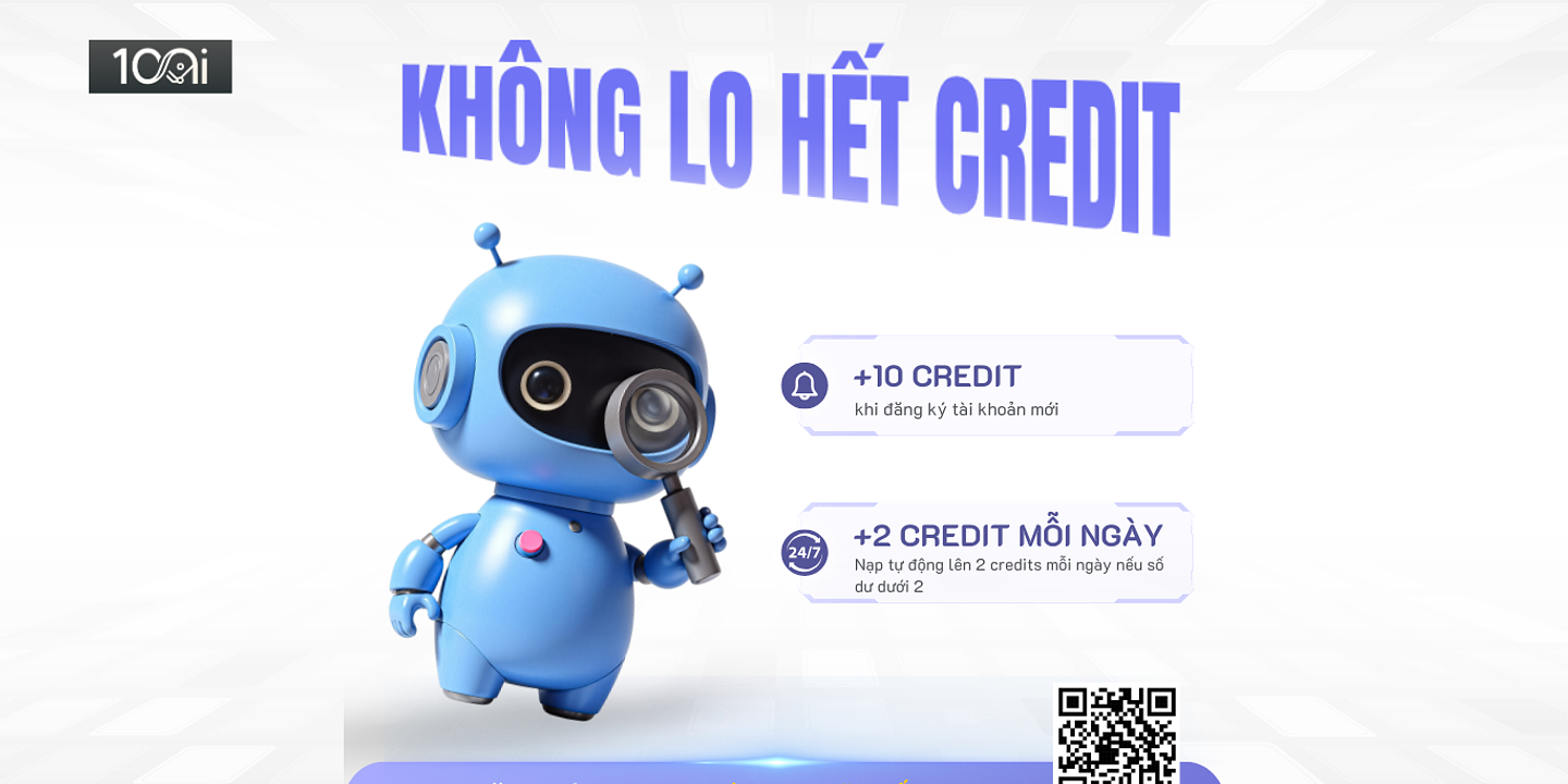 Khi tạo tài khoản mới trên 100AI.vn, hệ thống sẽ tặng ngay 10 credit miễn phí. Đây là số credit đủ để bạn trải nghiệm các tính năng cốt lõi như: