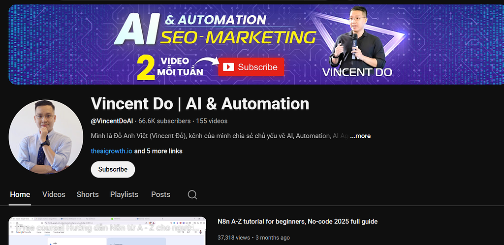 5. Vincent Do | AI & Automation. Nội dung của kênh bao gồm hướng dẫn cách sử dụng AI để tự động hóa quy trình công việc, prompt engineering A - Z, tối ưu hoá hệ thống, tạo ra “trợ lý số” cho doanh nghiệp, cá nhân. Nếu bạn đang tìm cách áp dụng AI vào công việc hàng ngày, từ tự động hóa tác vụ đơn giản cho đến triển khai hệ thống AI thì đây là một kênh bạn có thể theo dõi. Tham khảo tại: https://www.youtube.com/@VincentDoAI