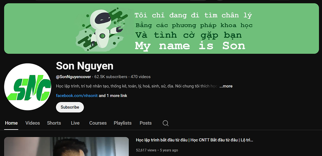 7. Son Nguyen. Kênh này có lộ trình học AI rất rõ ràng, bắt đầu từ Python cơ bản rồi tới các mô hình Machine Learning. Ưu điểm lớn nhất là phong cách giảng dạy mạch lạc, dễ hiểu, nhiều ví dụ thực hành. Khác biệt là kênh dành riêng cho người mới hoàn toàn, không yêu cầu nền tảng toán hay lập trình vững. Phù hợp với học sinh, sinh viên, hoặc bất kỳ ai mới bắt đầu tìm hiểu AI. Tham khảo tại: https://www.youtube.com/@SonNguyencover