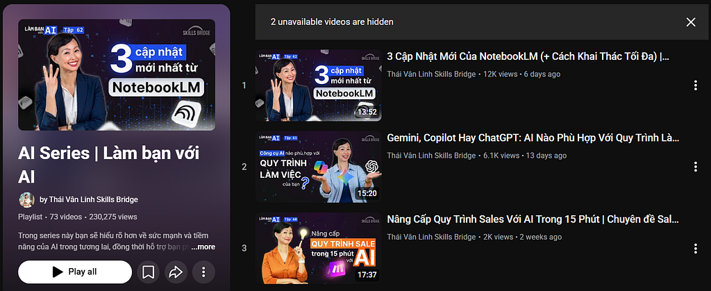 2. Thái Vân Linh Skills Bridge. Series "Làm bạn với AI" sẽ giúp bạn hiểu rõ hơn về sức mạnh và tiềm năng của AI trong tương lai, đồng thời hỗ trợ bạn phát triển bản thân và sự nghiệp một cách thông minh. Tại series này, bạn có thể tìm thấy một loạt các video về lịch sử, xu hướng, và tương lai của AI, cùng những bài phân tích sâu về vai trò của AI trong công việc và cuộc sống hàng ngày. Nếu bạn đang tìm nguồn cảm hứng để ứng dụng AI vào giáo dục và đổi mới phương pháp dạy học, kênh này có thể là tài nguyên bổ ích. Tham khảo tại: https://www.youtube.com/playlist?list=PLRRZj_bGaqnZL5gYajN7BPn2O-WwBNxxL