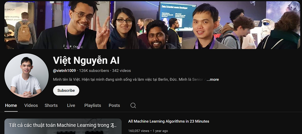 3. Việt Nguyễn AI. Chủ kênh là người có kinh nghiệm thực chiến trong ngành AI, kênh thường chia sẻ về các demo công cụ AI, hướng dẫn thuật toán, và các ánh nhìn cá nhân về xu hướng AI hiện nay, cách làm project, viết CV, xây dựng portfolio để apply học bổng, việc làm. Điểm mạnh là nội dung mang tính định hướng nghề nghiệp cao. Phù hợp với sinh viên CNTT, người học AI để phát triển sự nghiệp lâu dài. Tham khảo tại: https://www.youtube.com/@vietnh1009