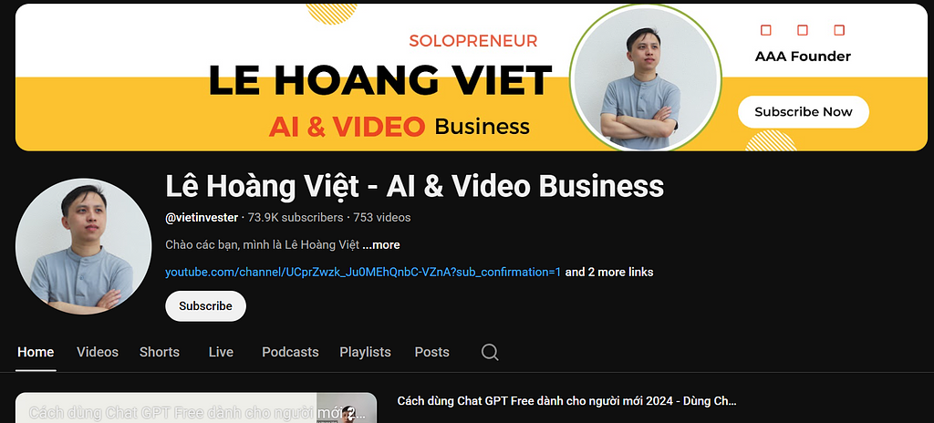 4. Lê Hoàng Việt - AI & Video Business. Nội dung kênh chủ yếu xoay quanh cách dùng AI hỗ trợ sản xuất video, xây dựng nội dung video hiệu quả, chiến lược video marketing và ứng dụng các công cụ AI vào sản xuất nội dung số. Rất phù hợp cho những ai muốn phát triển kênh YouTube, tạo content tự động, hoặc tích hợp AI vào quy trình sáng tạo (đặc biệt là giáo viên, creator, marketer). Tham khảo tại: https://www.youtube.com/@vietinvester