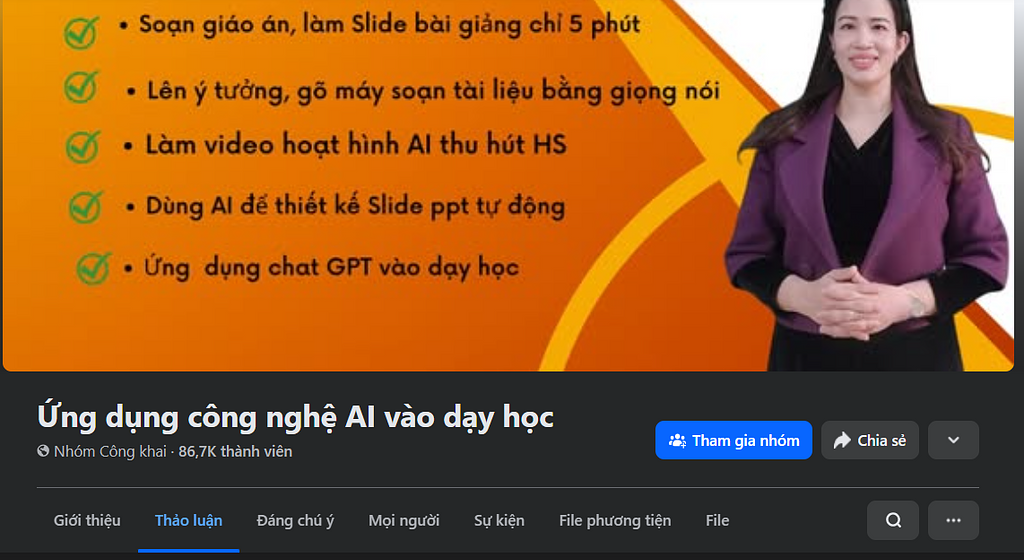 9. ThS. Nguyễn Kiều Oanh. Cô thường chia sẻ các kiến thức về ứng dụng AI trong giáo dục, giúp giáo viên tiếp cận và sử dụng công cụ công nghệ một cách thực tế, hiệu quả. Tại đây GV có thể tìm thấy vô số tips, hướng dẫn và tài nguyên miễn phí để tối ưu bài giảng, tạo học liệu tự động, cách soạn giáo án, thiết kế slide, tạo video hoạt hình hay sử dụng ChatGPT để tối ưu công việc giảng dạy chỉ trong vài phút. Tham khảo tại: https://web.facebook.com/groups/1810997752699280/