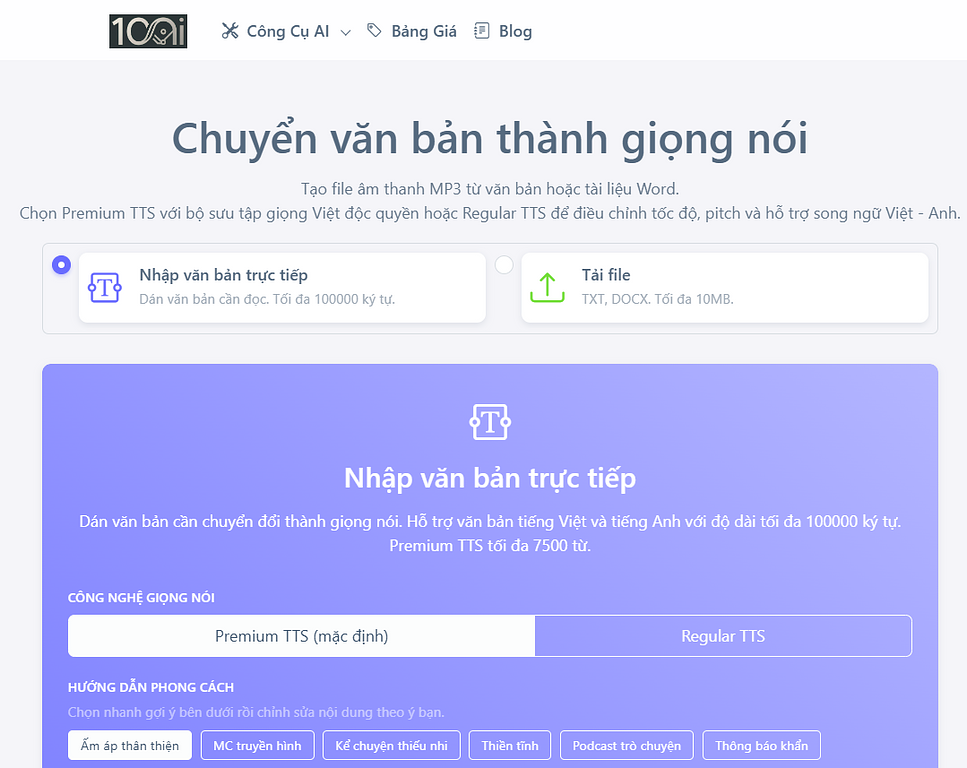 - Lựa chọn giọng đọc trên ai.100ai.vn: Nền tảng cung cấp bộ sưu tập Premium TTS với hơn 60 giọng đọc được tuyển chọn theo nhiều phong cách: MC truyền hình, kể chuyện thiếu nhi, Podcast trò chuyện, hay quảng cáo nhiệt huyết. Các giọng đọc như Diệu My (sáng rõ), Mai Hương (dịu dàng) hay Minh Ánh (sắc nét) giúp truyền tải cảm xúc tự nhiên, ngắt nghỉ hợp lý giống hệt người thật, có hỗ trợ cả tiếng Anh và tiếng Việt.