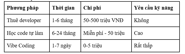 Trước đây, tất cả những nhu cầu này đều yêu cầu thuê lập trình viên với chi phí hàng chục đến hàng trăm triệu đồng và thời gian chờ đợi hàng tháng. Nhưng giờ đây, với sự xuất hiện của Vibe Coding, bất kỳ ai cũng có thể tự tay biến những ý tưởng đó thành hiện thực mà không cần có background về lập trình.
