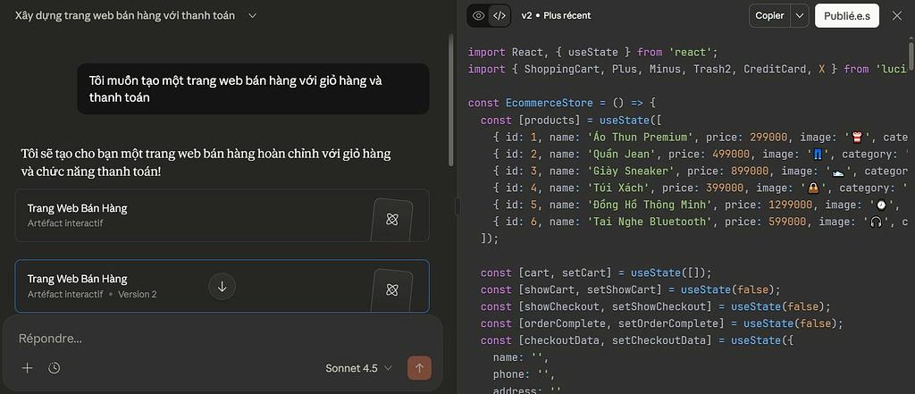Ví dụ thực tế rất đơn giản: thay vì phải học HTML, CSS, JavaScript trong nhiều tháng liền, bạn chỉ cần nói với AI rằng "Tôi muốn tạo một trang web bán hàng với giỏ hàng và chức năng thanh toán" và AI sẽ tạo ra cho bạn một website hoàn chỉnh với đầy đủ các tính năng đó. Đây chính là sức mạnh của Vibe Coding - biến ý tưởng thành hiện thực chỉ trong vài phút thay vì vài tháng. Bạn có thể tham khảo thử ví dụ tại đây: https://claude.ai/public/artifacts/c748e015-5974-405b-a28e-828b07eb609a